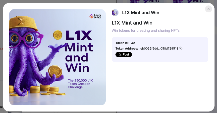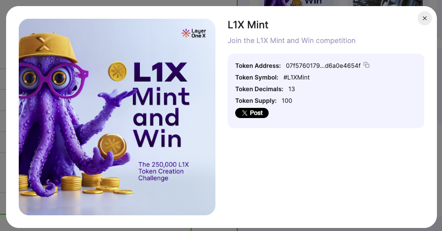 Click the button marked XPost displayed in the image above to share your newely created token on X (Twitter) and go in the draw to win a daily prize of 500 L1X Coins!
