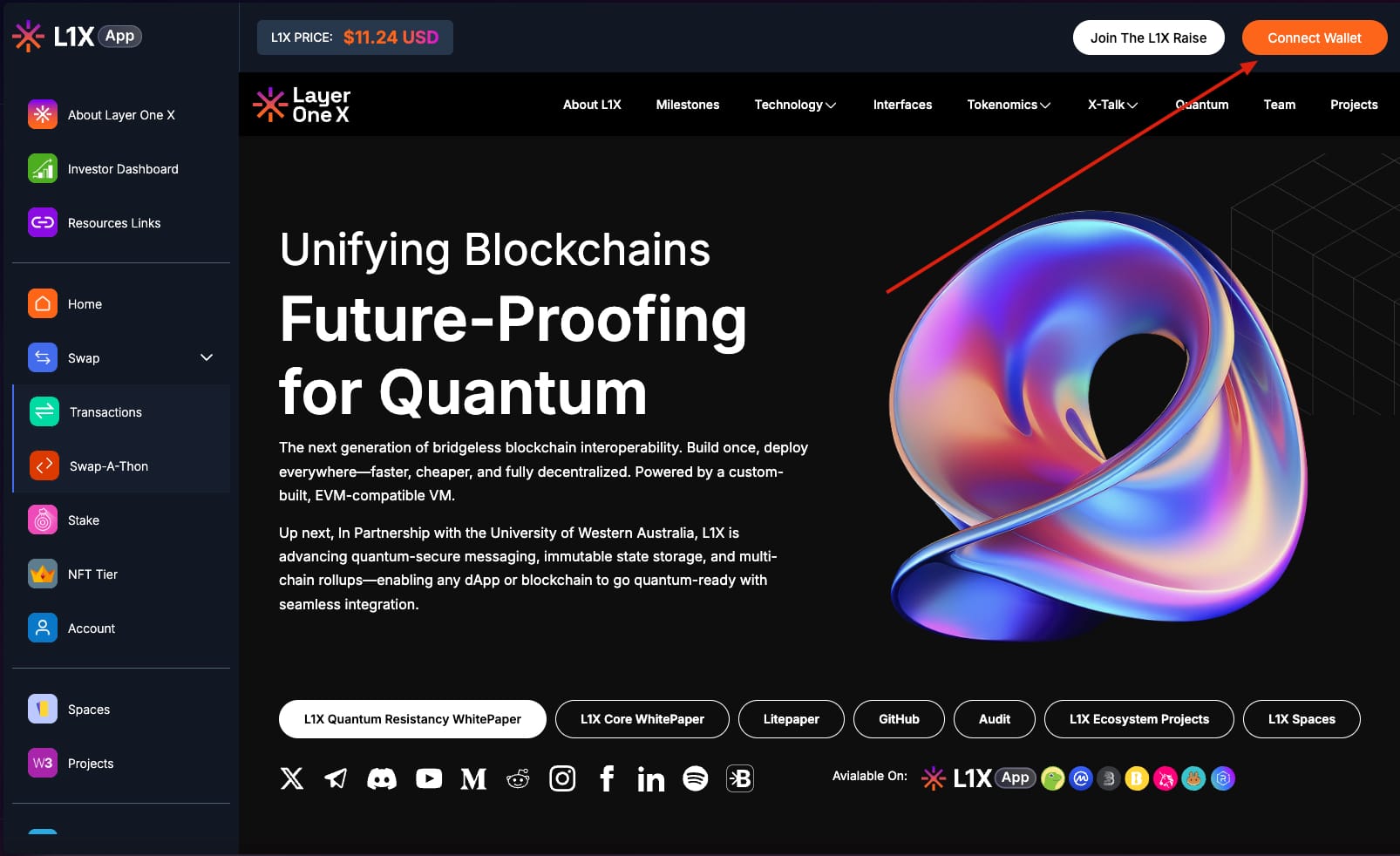 Visit the L1X App and click on the orange “Connect Wallet” button in the top right. Choose your wallet and ensure it’s connected correctly — this is where your referral rewards will be sent.