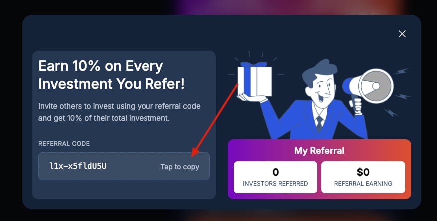 Tap to copy your unique referral code. You can now share this across X, Telegram, Discord, WhatsApp, or anywhere your crypto network lives. When someone uses your code to invest, both of you benefit. Your rewards will be automatically credited to your wallet address after the completion of each tranche.