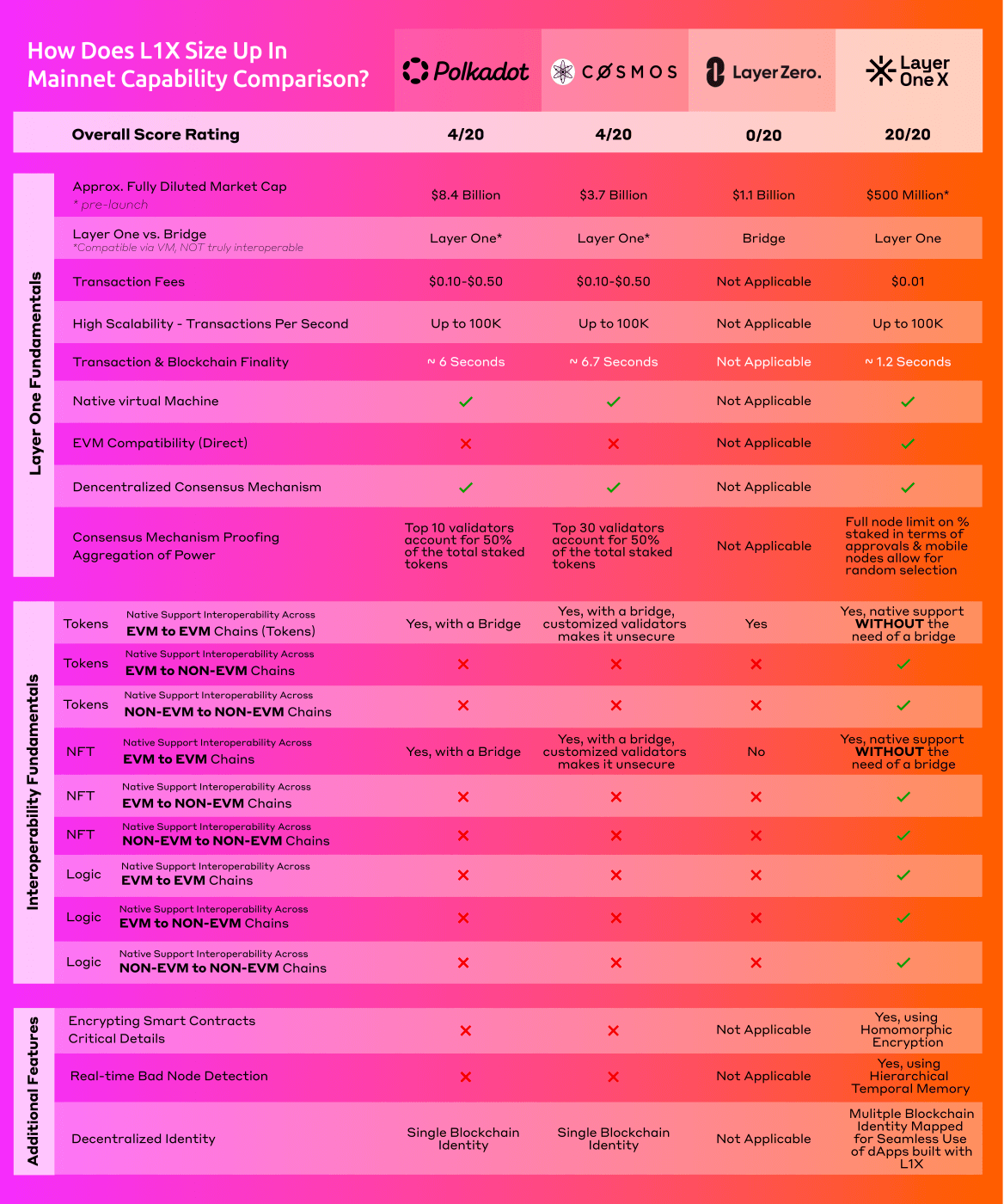 Layer One X takes the cake when compared to interoperable blockchains and MainNet capabilities. But don't just take our word for it - let's compare the details and find out why L1X is the clear winner in comparison.