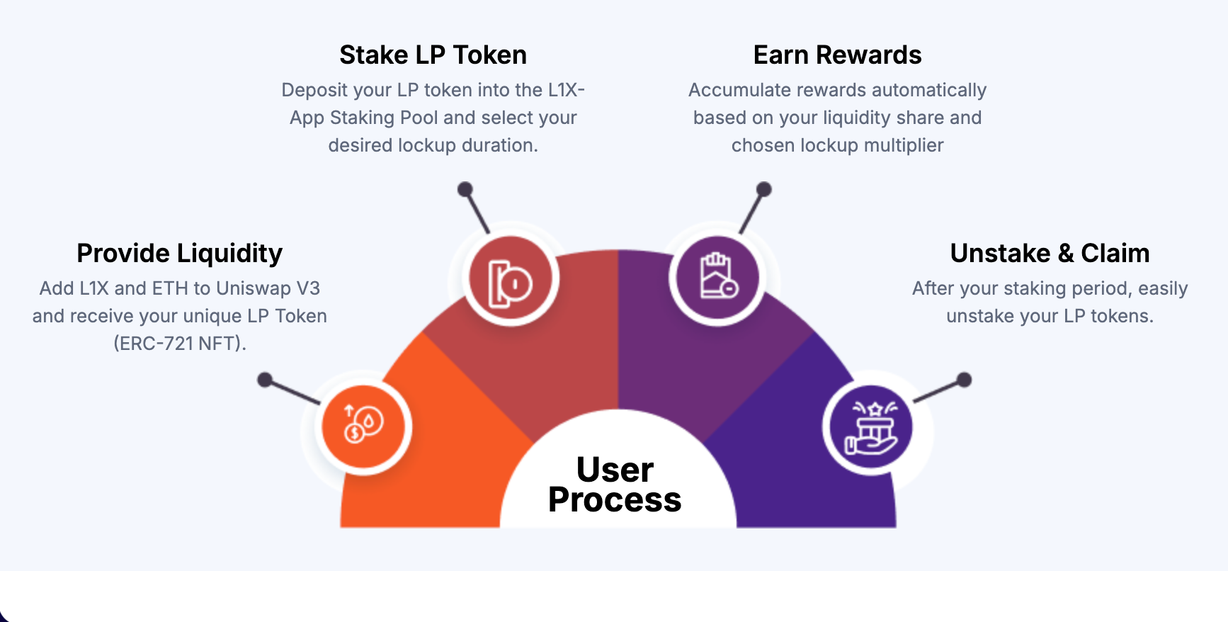 The L1X Liquidity Staking & Rewards system is designed to reward users who provide liquidity to the L1X/ETH pool on Uniswap V3. By staking your LP tokens (ERC-721 NFTs) into the L1X-App Staking Pool, you maximize your earnings through dynamic rewards based on your share of liquidity and chosen lockup period. Whether you're a DeFi veteran or new to Web3, our intuitive staking platform helps you earn passive income effortlessly.