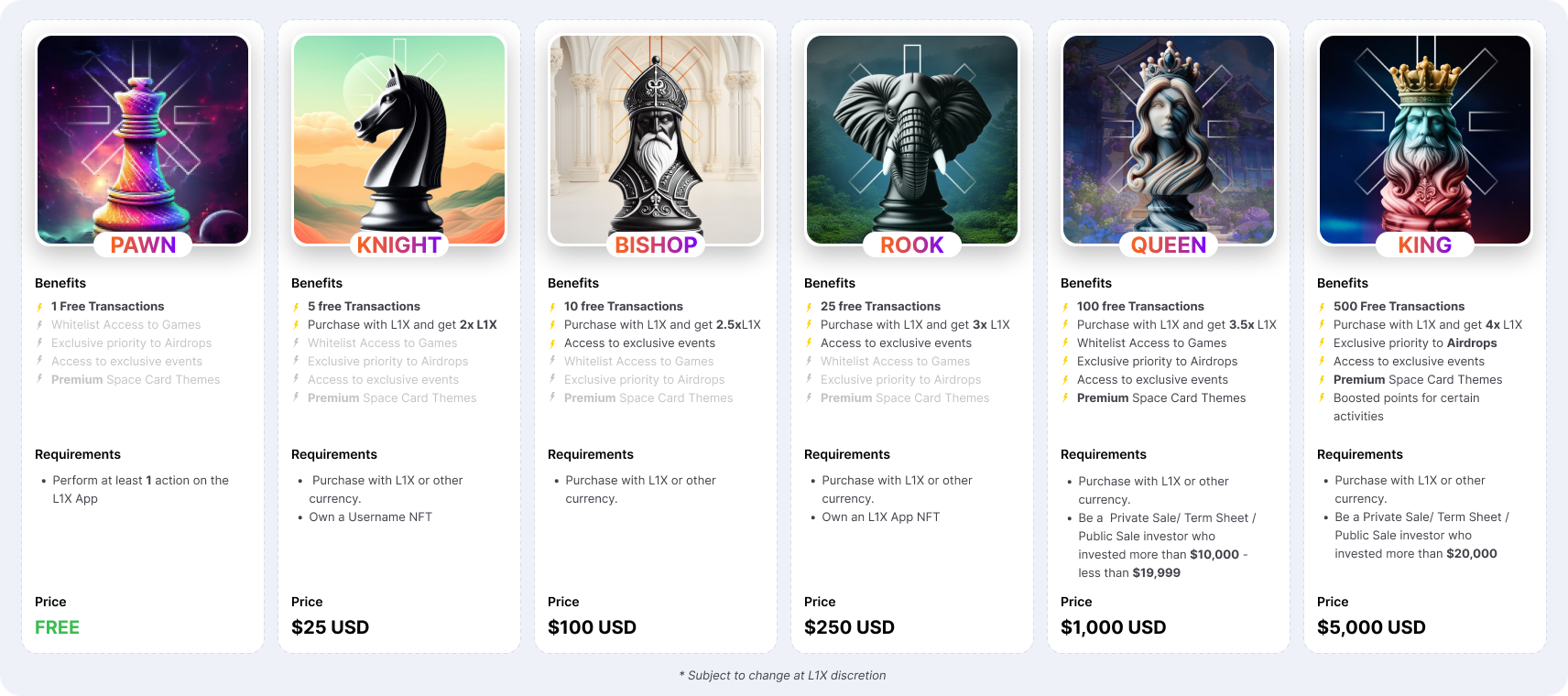 We are launching 6 L1X NFTs collections, with a chess based aesthetic, each offering unique benefits and requiring specific conditions or levels of engagement to acquire. To obtain an NFT there will be certain options or conditions: