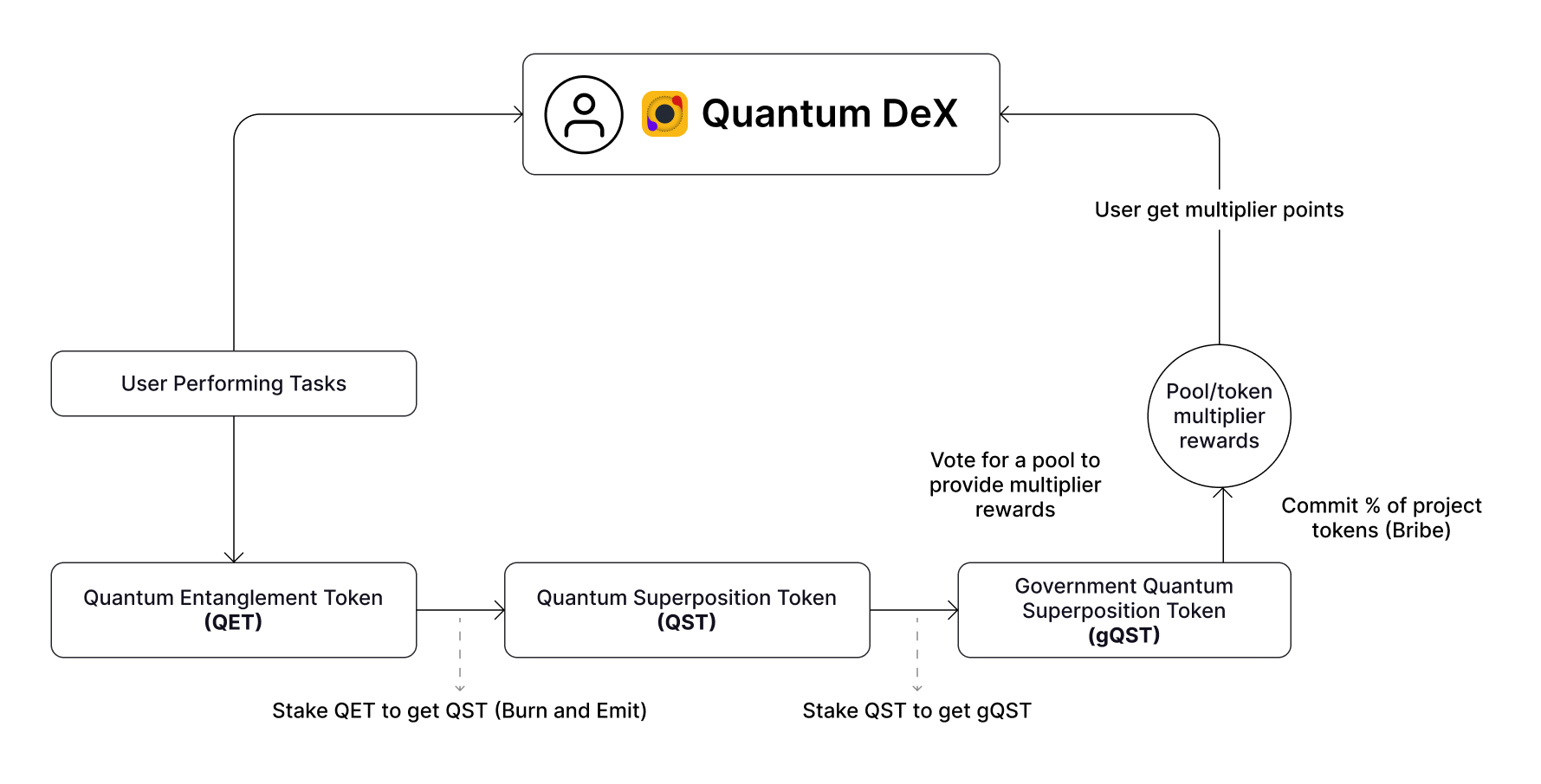QST can be staked for gQST (governance QST), unlocking both decision making power and protocol revenue share. A portion of trading fees collected by Quantum DeX are allocated to gQST holders, either directly as rewards or indirectly via buybacks, liquidity reinforcement, or yield mechanisms.