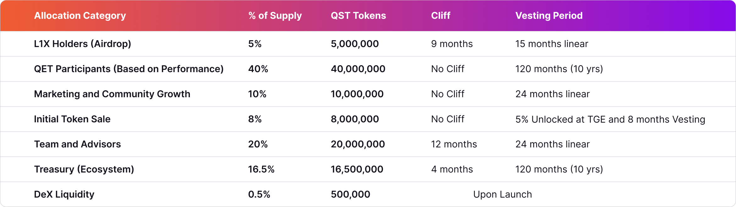 Table 1 shows the allocation breakdown of QST’s 100 million supply, including each category’s percentage, token amount, and vesting schedule (cliffs and vesting periods):